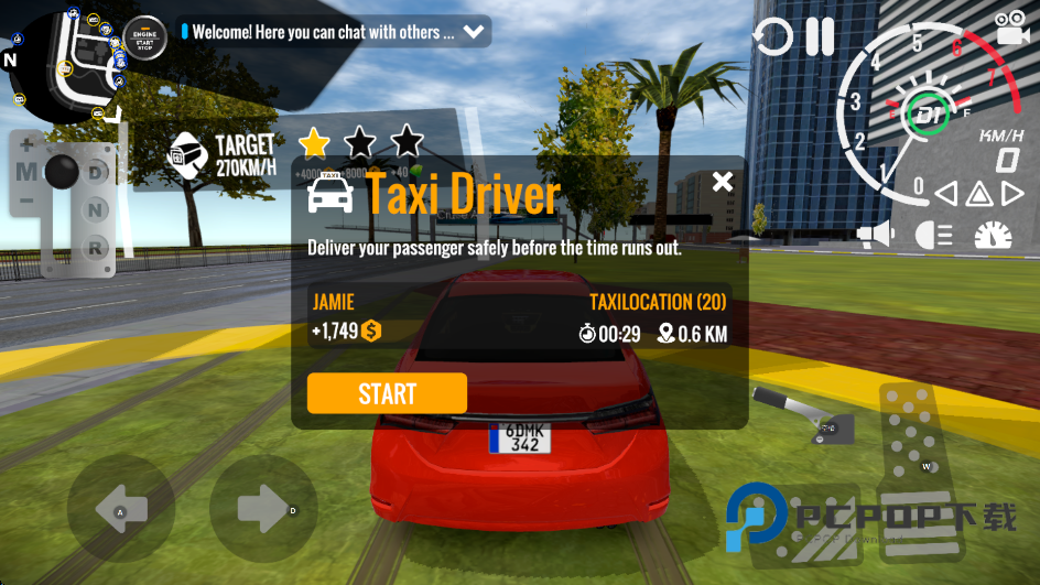 6、车辆的转向由屏幕左下方的方向键控制,屏幕右下方可以控制车辆的油门、刹车、手刹,并且游戏中还可以实现车辆的喇叭、左右转向灯等等共功能。