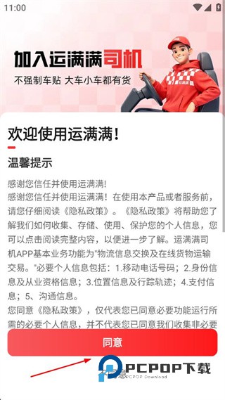 1、打开运满满司机APP,查看弹出的温馨提示及隐私政策,点击“同意”按钮继续。