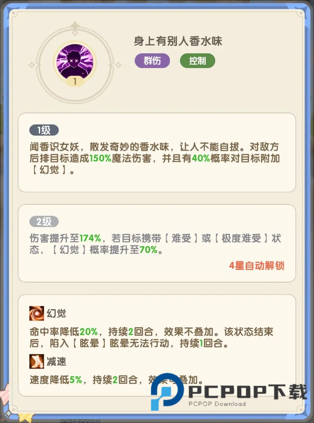 “幻觉” 不仅降低敌方命中率,结束后还能使目标 陷入眩晕,是关键时刻的绝佳控制技能。
