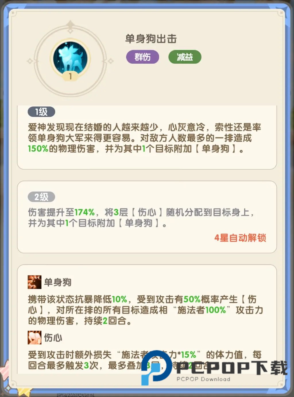 ●搭配思路:冰雪女王、九尾妖狐、火姑娘的AOE技能,触发“伤心”效果,让敌人持续掉血,配合输出一波清场。