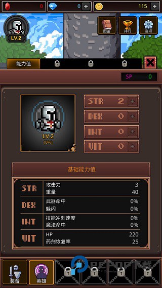 1、卡通休闲的像素式游戏画风,在地牢世界不断冒险挑战,提高等级战力。