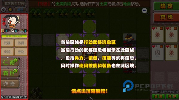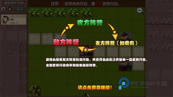 每关有多名武将登场,分别由玩家阵营和电脑车营组成两个阵营进行交替的行动,当玩家行动开始时,玩家可以点击任意一名武将进行行动,武将行动完毕后进行其他尚未行动的武将行动,所有武将行动完毕点击结束回合轮到电脑行动电脑行动完毕后又开始玩家回合循环交替。