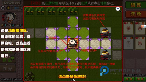 武将兵力是该武将HP,当兵力小与1时需向其他武将求援,若求援失败,则被击退,在弃牌阶段,每100点兵力可以让武将保留一张手牌行动力行动力:在回合开始阶段会增加6(坐骑可以增加)本回合行动力只能在该回合使用,选择目标地点进行移动会消耗行动力,不同地形消耗不同有些地形则不能移动。
