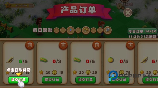 3、收集农产品并完成订单能够让你获得更多金币去购买更多道具,或者获得升级所需的经验值。