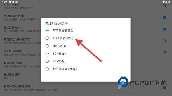 3、点击首选视频分辨率或类似名称,如画面质量,弹出选项点击最高的即可。