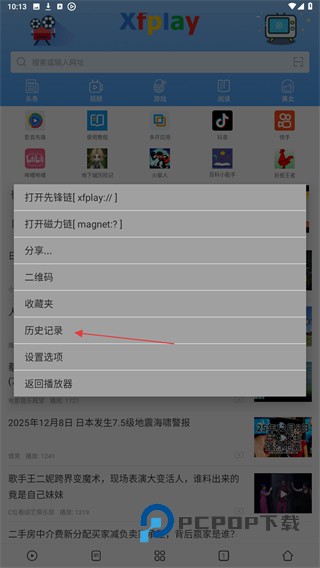 3、当界面弹出菜单栏时,选择并点击历史记录即可查看。