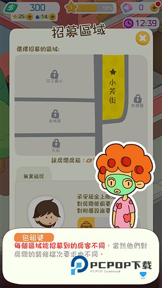 4、每个区域能招募到的房客不同,当然他们对房间的装修档次要求也不同。