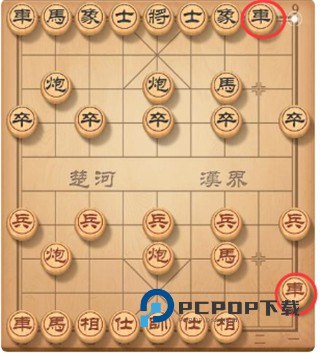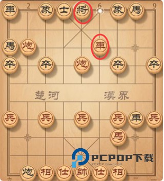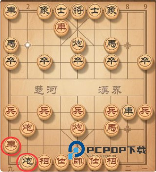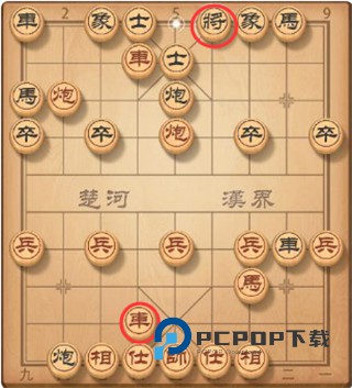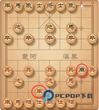 4、红方车平移到宫格边,黑方车过河捉双兵;