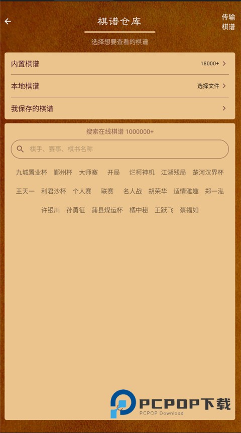 该模式中我们可以查看选择不同的棋谱,同时也支持本地导入棋谱,当然你也可以在线搜索棋手、赛事、棋读;