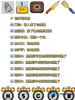 7、闹钟S:及时提醒玩家,牛排需进行切割、翻炒或煮熟处理;