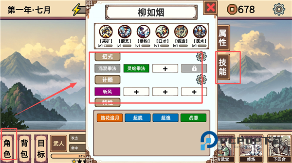 10、点击【角色】进入【技能】界面,玩家可携带上战的招式以及计略,随着角色境界的提升,可携带的招式和计略数量也会增加。