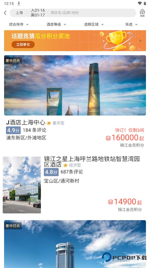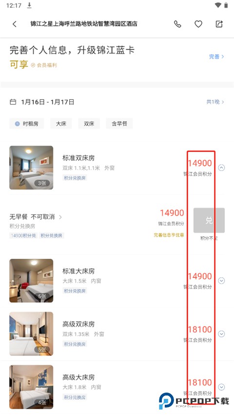 4、在酒店首页向下拉,你可以看到非常多种类的房间,以及相应的积分,如果积分足够动画,选择时间,点击兑换即可。