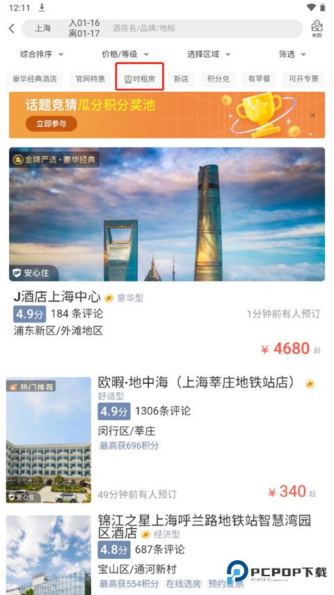 3、里面为用户提供了非常丰富酒店的类型,如经典酒店、官网特惠、时租房、等等,我们点击时租房,即钟点房;