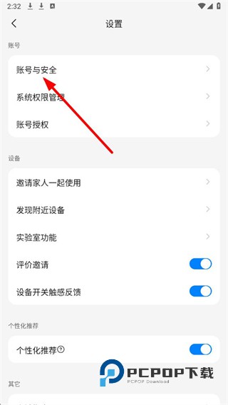 2、进入设置页面后,找到账号与安全选项并点击,进入账号安全界面。