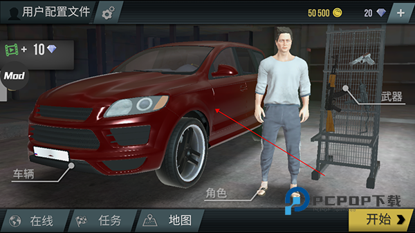 1、进入到火力全开2城市狂热游戏后,点击人物身边的车辆。