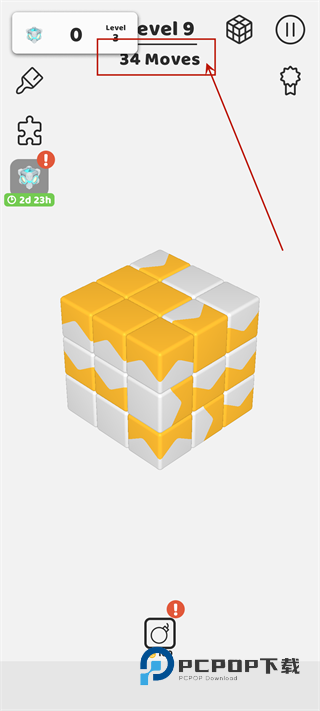 4、游戏上方Moves代表的当前关卡可点击的次数,玩家需要在有限次数内将所有的积木消除