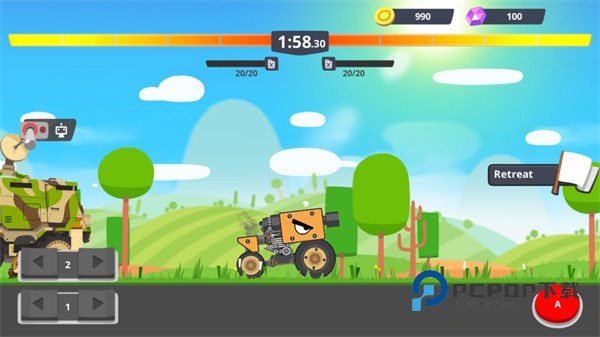 另外,游戏操作玩法也是非常的简单,玩家只需要通过控制虚拟键盘即可控制炮车的前进方向,游戏中为玩家提供了主炮、辅助武器,主炮是可以通过调整位置来瞄准敌人的方向,辅助武器主要是帮助玩家提高伤害。总的来说超级战车大作战这游戏简单易上手,可玩性确实高,有着不错的画面风格和音效表现,千变万化的战车组合玩法也让人很容易沉迷其中,对战部分虽然稍显操作自由度不够,但依然能保证一定的趣味性,并且本游戏可以在设置内设置中文,喜欢的玩家可以来下载体验一下哦!