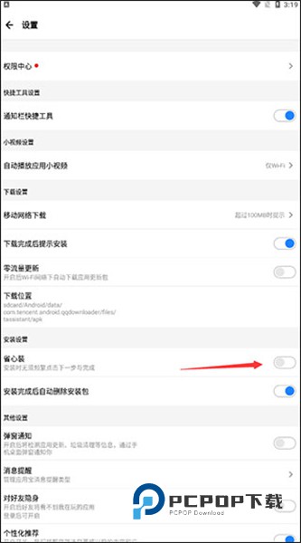 2.进入菜单后,找到安装设置中的”省心裝“,将右侧的按钮打开,打开省心裝按钮需要打开root权限;