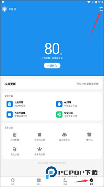 1.首先我们点击应用包软件进入软件主页面,点击最下方的【管理】按钮,进入管理页面后,点击右上角的菜单标志,如下方箭头所示;