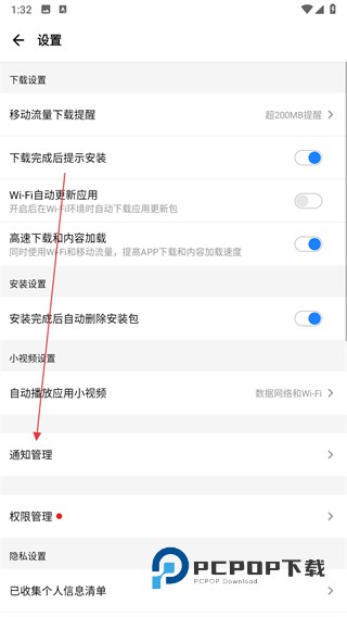 3、在设置页面,点击通知管理选项。