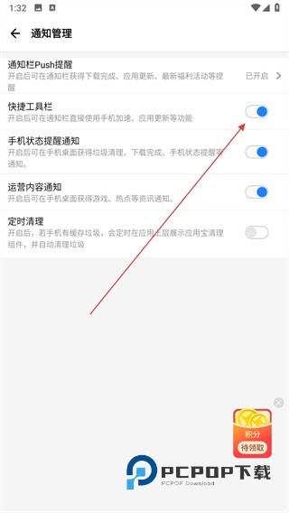 4、找到快捷工具栏选项,点击开关按钮。