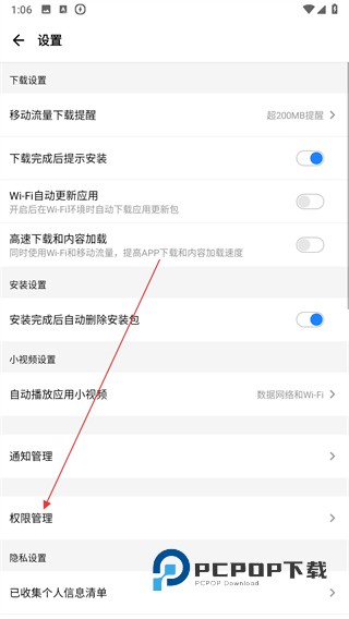 3、在设置界面里,找到权限管理选项并点击,进入权限管理页面。
