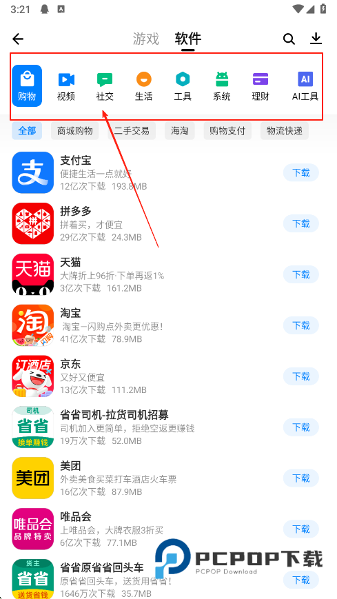 1、打开应用商店,进入软件板块,可看到购物,视频,社交等分类,根据需求选择分类,浏览对应类别的软件,找到想要的软件后,点击下载即可。