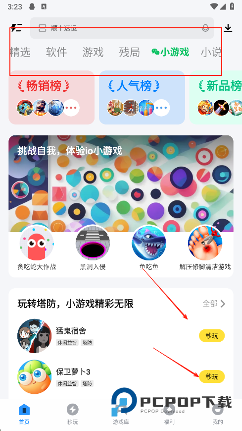 2、切换到小游戏板块,能看到畅销榜,人气榜,新品榜等榜单,还有各类小游戏推荐,看到喜欢的小游戏如猛鬼宿舍,保卫萝卜3,点击秒玩,可快速体验游戏。
