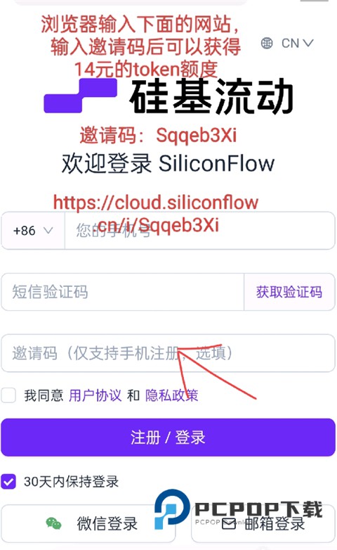 4、在浏览器输入https://cloud.siliconflow.cn/i/Sqqeb3Xi进行账号登录,填写Sqqeb3Xi邀请码;