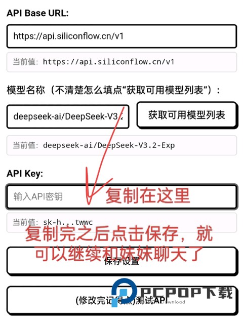 7、复制在下方密钥中之后点击保存,就可以继续和妹妹聊天了。