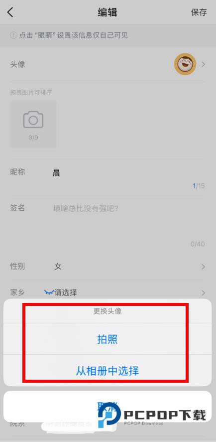 4、在头像更改界面,选择拍照或从相册中选择,即可完成头像修改。