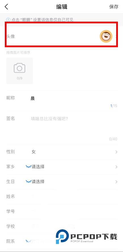3、在资料编辑页面,点击头像区域,进入头像更改界面。