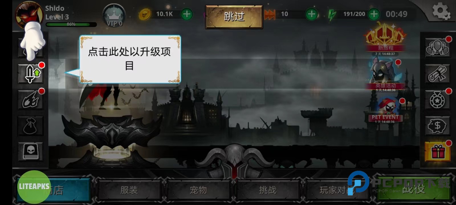 10、另外,大家除了要掌握玩法以外,英雄的养成也不可或缺,在主页中点击下方图片的这个位置可以升级项目。