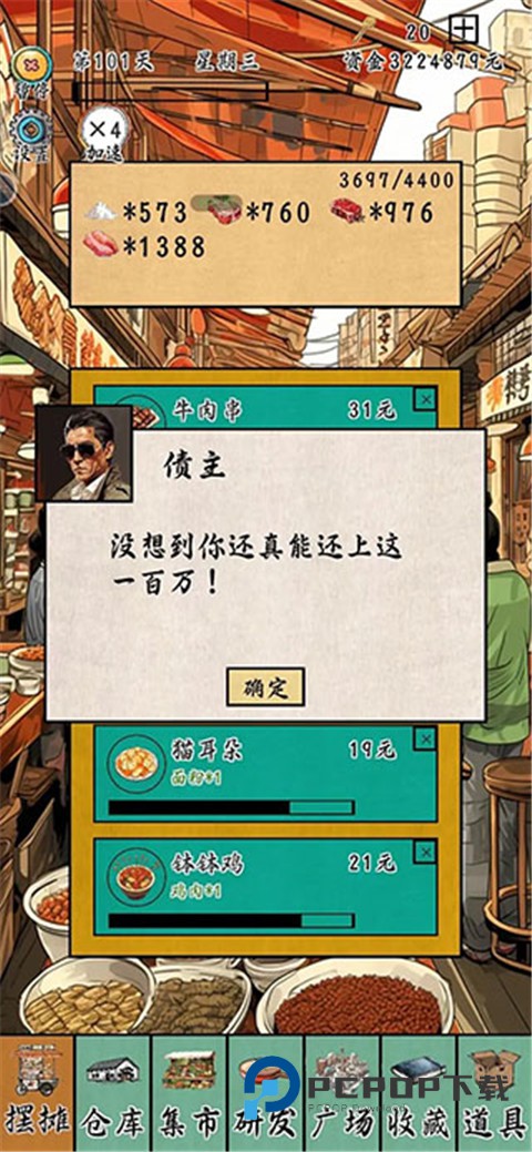 摆摊一百天游戏是一款以中华各地特色小吃为主题的策略+模拟经营所有,玩家需要通过一百天的时间赚足目标金额。游戏里你将扮演一名小摊主,通过摆地摊来赚取人生的第一桶金,制定出正确的经营策略,根据市场的需求来进行售卖当下最需要的美食,体验全新的经营乐趣。