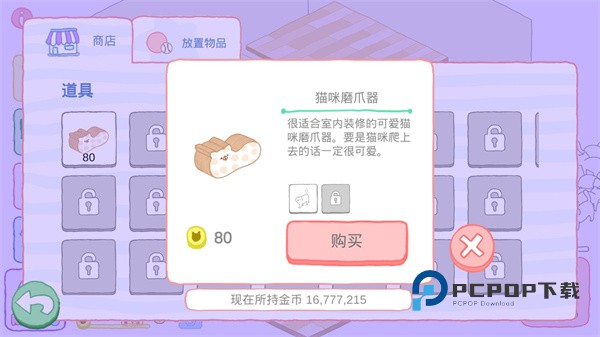 3、可以购买猫抓板,猫塔等等,也可以买新的房间哦;