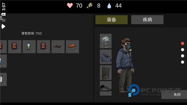 2、点击"New Game"进入游戏,打开背包,你可以看到自己的装备,疾病等等。
