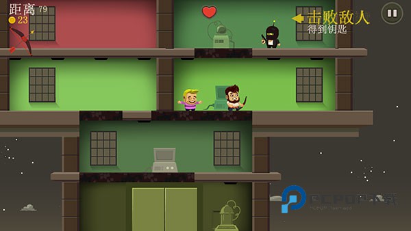 1、游戏操作非常简单,玩家只需上下滑动屏幕即可操控大胡子上下跳跃,来回穿梭撞击在各个楼层之间,躲避敌人攻击的同时攻击敌方,解救人质。