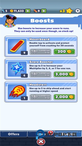 2、商店可购买技能和道具。玩家们在游戏中会收集众多金币,可以利用这些金币到游戏商店中购买技能和道具,道具主要有加速、磁铁、滑板等。
