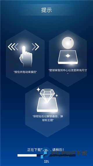4、按住并拖动来操控,使球掉落到中心以改变砖块尺寸,获取钻石以解锁曲目、弹球和主题;