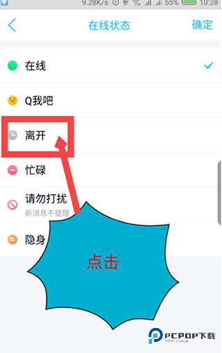 5、在打开的在线状态界面,选择离开选项,点击一下。