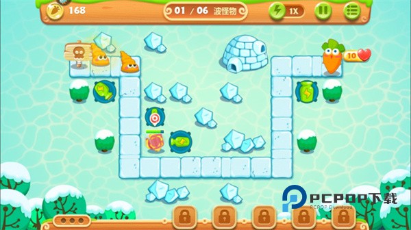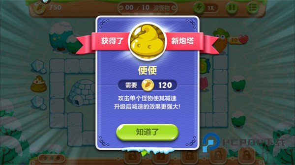 7、然后便可进入下一关,会有不同的炮塔会慢慢出现,不同的炮塔功能也不同,比如便便,攻击单个怪物使其减速,升级后减速的效果更强大;