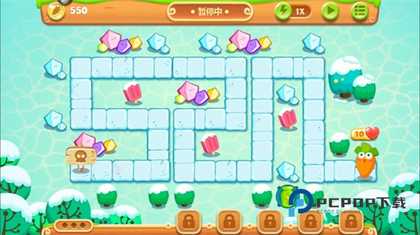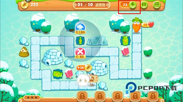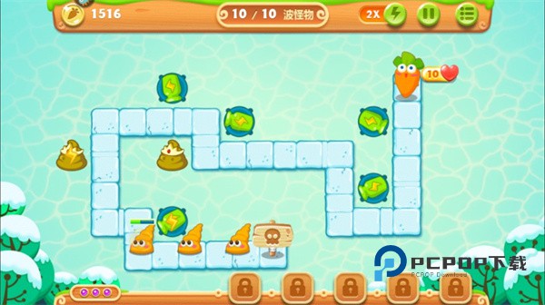 9、如果萝卜被咬了10口则会游戏失败,所以玩家尽可能的要多建造炮塔;