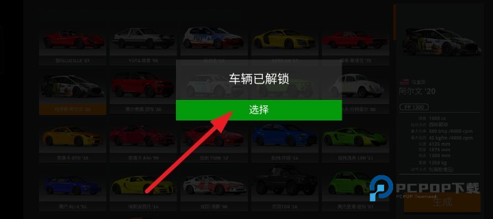 3、然后选择自己想驾驶的汽车,点击右下角的解锁,如下图所示解锁成功,最后点击生成即可。