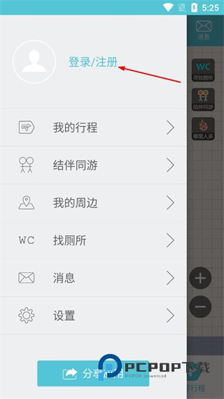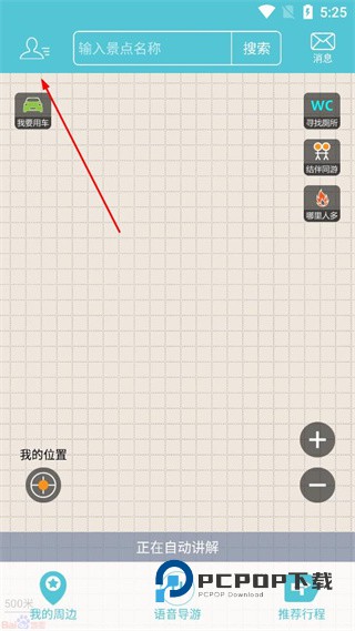 1、打开该景点导航软件主界面,点击左上角的个人头像按钮,展开功能菜单列表。