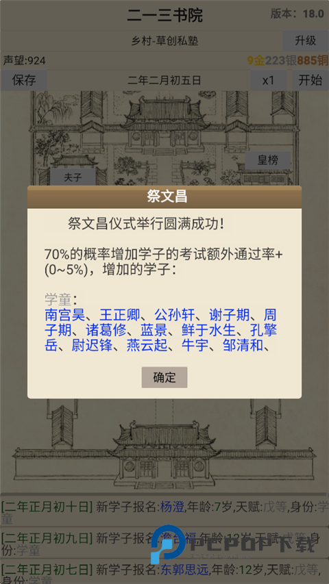 古代书院模拟器手游中还会随机出现各种活动,如可以提高学子考试额外通过率的祭文昌仪式,还有能增加学子学识、写作的中秋诗会,也有为增加夫子心情、忠诚而举办的登高祭师礼活动。打造你的百年书院,育尽天下英才!