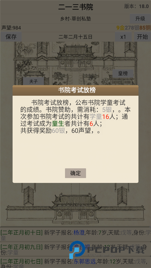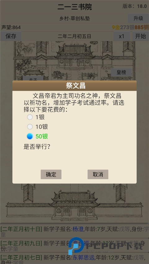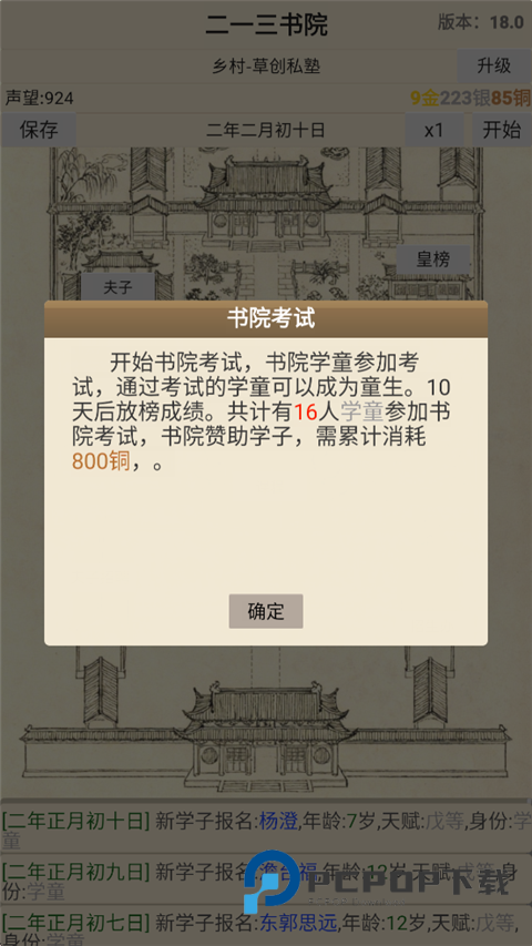 6、开始书院考试,需要耗费800铜。