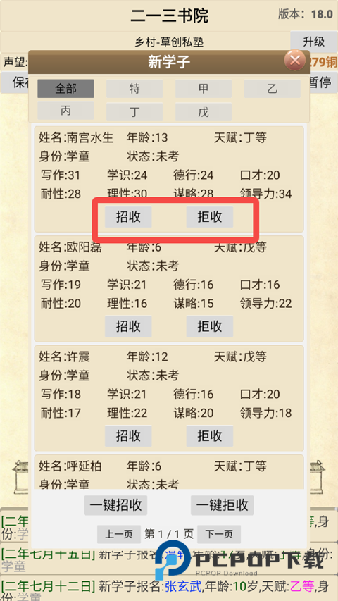 1、每年春季、夏季都会招生,玩家需要到招生办招收资质合适的学子,资质不好的可以拒收。