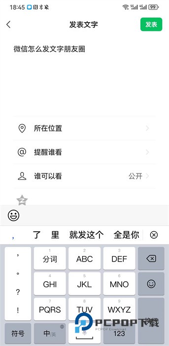 4、在朋友圈编辑界面,只需要【输入想要发布的纯文字朋友圈】,就可以直接点击右上角的发布,发布文字朋友圈不带图片。