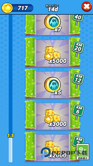 4、不断跳跃躲避各种障碍物和陷阱,还可以收集沿途的金币,可以用来解锁更多的道具,帮助自己轻松过关,