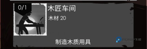 木匠车间需要使用20木材进行建造。玩家可以在木匠车间中设置一位工人成为木匠,在这里建造木质工具。在木匠车间中可以制造锤子、手推车、木矛等工具,可以用来加快工人们的工作速度,也可以用来制作简单的武器。木匠车间的物品都需要使用木材进行制造,后续可以升级,每升级一次就可以制作新物品,最高可升至3级。